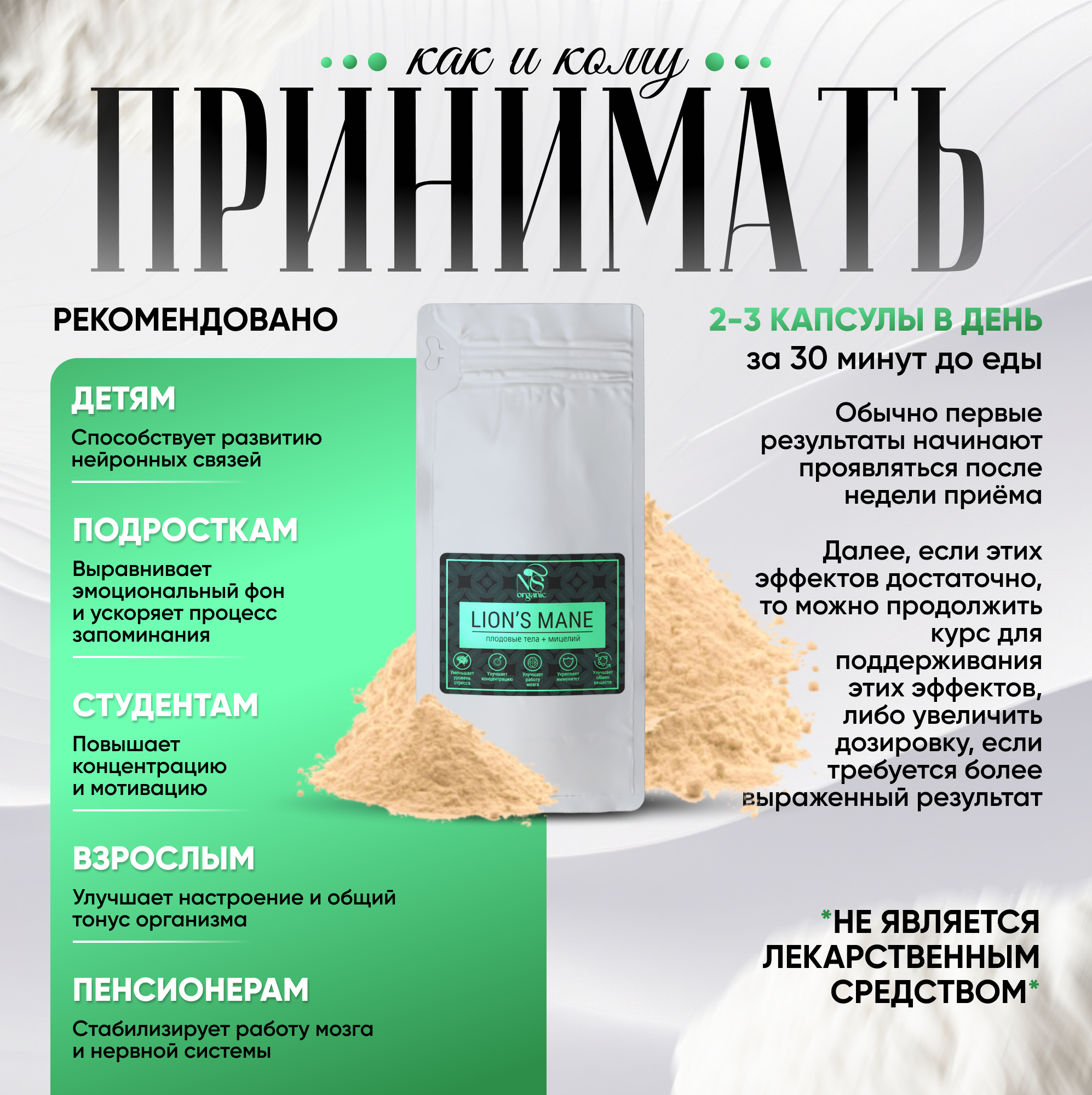 Ежовик гребенчатый рода Hericium (герициум) – ценнейший и редкий гриб, широко применяемый в традиционной китайской и европейской медицине. Эти удивительные лекарственные грибы, благодаря своему необычному внешнему виду, имеют множество забавных названий: львиная грива, lions mane, обезьянья голова, грибная лапша, дедова борода, борода сатира, воздушная рыба, шишигашира, бородатый зуб. Французы зовут его пом-пом, японцы – ямабушитаке, в Китае – хоутоугу. Ежевик ценится не только за свои превосходные вкусовые качества, как деликатесный веганский продукт здорового питания или еда - суперфуд. Умный гриб обладает поистине уникальными свойствами. Это натуральный природный ноотроп, антистресс, антидепрессант. Синтетические ноотропные средства искусственно подстегивают и стимулируют выработку биологически активных веществ. Ежевик мягко запускает нейрогенез, восстанавливает нарушенные нейронные связи, обеспечивает восстановление и защиту нейронов. Он обеспечивает восстановление когнитивных функций головного мозга, применяется для улучшения памяти, мозговой активности, предотвращает и лечит такие недуги, как деменция, болезнь Альцгеймера и другие неврологические и нейродегенеративные заболевания. Экстракт ежовика помогает нормализовать сон, укрепить эмоциональное здоровье, избавит от тревожности, поможет забыть, что такое депрессия и выгорание, синдром дефицита внимания. Прекрасное природное успокоительное лекарство. Препарат из ежевика гребенчатого благотворно влияет на желудок и кишечник, нормализует обмен веществ и уровень сахара в крови. Он применяется для снижения веса при лечении ожирения. Микродозинг ежовика улучшает кровообращение, препятствует образованию тромбов; обладает антиоксидантным и противоопухолевым действием. Отличное решение для повышения иммунитета, энергии и общего тонуса организма. Хорошо зарекомендовал себя как противовоспалительное и антибактериальное средство. Благотворно влияет на организм, подходит как взрослым женщинам, так и мужчинам. Наша пищевая добавка изготавливается из качественного, экологичного сырья, выращенного в России. Продукция прошла лабораторные испытания, сертифицирована и абсолютно безопасна. Выпускается в двух формах: желатиновые капсулы (60, 90 штук) и порошок, содержащий сухие измельченные грибы (плодовое тело гриба и мицелий в равных пропорциях). Сушеный молотый грибной зерномицелий (это своеобразные корни или семена ежовика, проросшие в питательном и очищенном зерновом субстрате) обладает повышенной концентрацией полезных веществ – эринацинов. Именно они отвечают за рост и восстановление нервных клеток и их оболочек. Оптимальный состав для улучшения работы мозга и нервной системы. Противопоказанием к применению является беременность, период лактации, детский возраст, индивидуальная непереносимость. Мы будем благодарны, если Вы поделитесь в отзывах своим опытом применения препарата, чтобы помочь нам стать лучше, а другим покупателям – сделать правильный выбор!