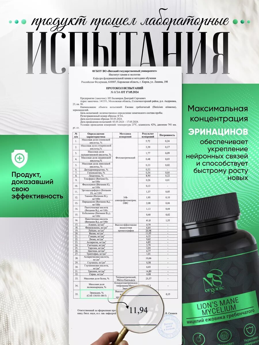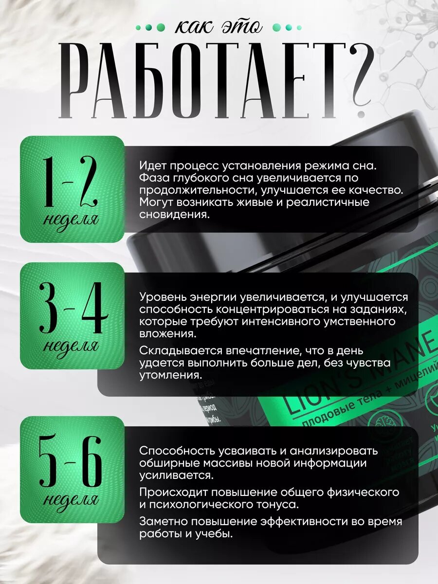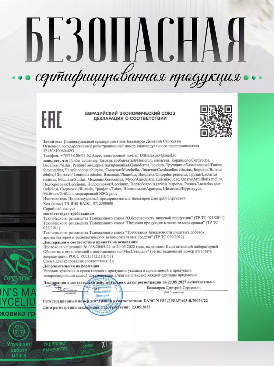 Ежовик гребенчатый рода Hericium (герициум) – ценнейший и редкий гриб, широко применяемый в традиционной китайской и европейской медицине. Эти удивительные лекарственные грибы, благодаря своему необычному внешнему виду, имеют множество забавных названий: львиная грива, lions mane, обезьянья голова, грибная лапша, дедова борода, борода сатира, воздушная рыба, шишигашира, бородатый зуб. Французы зовут его пом-пом, японцы – ямабушитаке, в Китае – хоутоугу. Ежевик ценится не только за свои превосходные вкусовые качества, как деликатесный веганский продукт здорового питания или еда - суперфуд. Умный гриб обладает поистине уникальными свойствами. Это натуральный природный ноотроп, антистресс, антидепрессант. Синтетические ноотропные средства искусственно подстегивают и стимулируют выработку биологически активных веществ. Ежевик мягко запускает нейрогенез, восстанавливает нарушенные нейронные связи, обеспечивает восстановление и защиту нейронов. Он обеспечивает восстановление когнитивных функций головного мозга, применяется для улучшения памяти, мозговой активности, предотвращает и лечит такие недуги, как деменция, болезнь Альцгеймера и другие неврологические и нейродегенеративные заболевания. Экстракт ежовика помогает нормализовать сон, укрепить эмоциональное здоровье, избавит от тревожности, поможет забыть, что такое депрессия и выгорание, синдром дефицита внимания. Прекрасное природное успокоительное лекарство. Препарат из ежевика гребенчатого благотворно влияет на желудок и кишечник, нормализует обмен веществ и уровень сахара в крови. Он применяется для снижения веса при лечении ожирения. Микродозинг ежовика улучшает кровообращение, препятствует образованию тромбов; обладает антиоксидантным и противоопухолевым действием. Отличное решение для повышения иммунитета, энергии и общего тонуса организма. Хорошо зарекомендовал себя как противовоспалительное и антибактериальное средство. Благотворно влияет на организм, подходит как взрослым женщинам, так и мужчинам. Наша пищевая добавка изготавливается из качественного, экологичного сырья, выращенного в России. Продукция прошла лабораторные испытания, сертифицирована и абсолютно безопасна. Выпускается в двух формах: желатиновые капсулы (60, 90 штук) и порошок, содержащий сухие измельченные грибы (плодовое тело гриба и мицелий в равных пропорциях). Сушеный молотый грибной зерномицелий (это своеобразные корни или семена ежовика, проросшие в питательном и очищенном зерновом субстрате) обладает повышенной концентрацией полезных веществ – эринацинов. Именно они отвечают за рост и восстановление нервных клеток и их оболочек. Оптимальный состав для улучшения работы мозга и нервной системы. Противопоказанием к применению является беременность, период лактации, детский возраст, индивидуальная непереносимость. Мы будем благодарны, если Вы поделитесь в отзывах своим опытом применения препарата, чтобы помочь нам стать лучше, а другим покупателям – сделать правильный выбор!