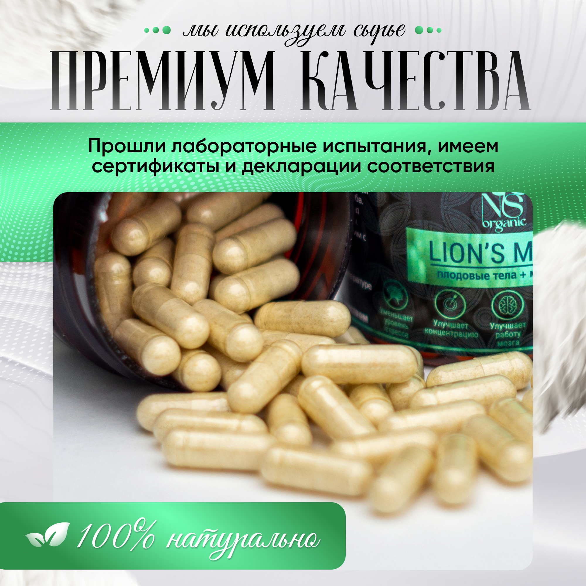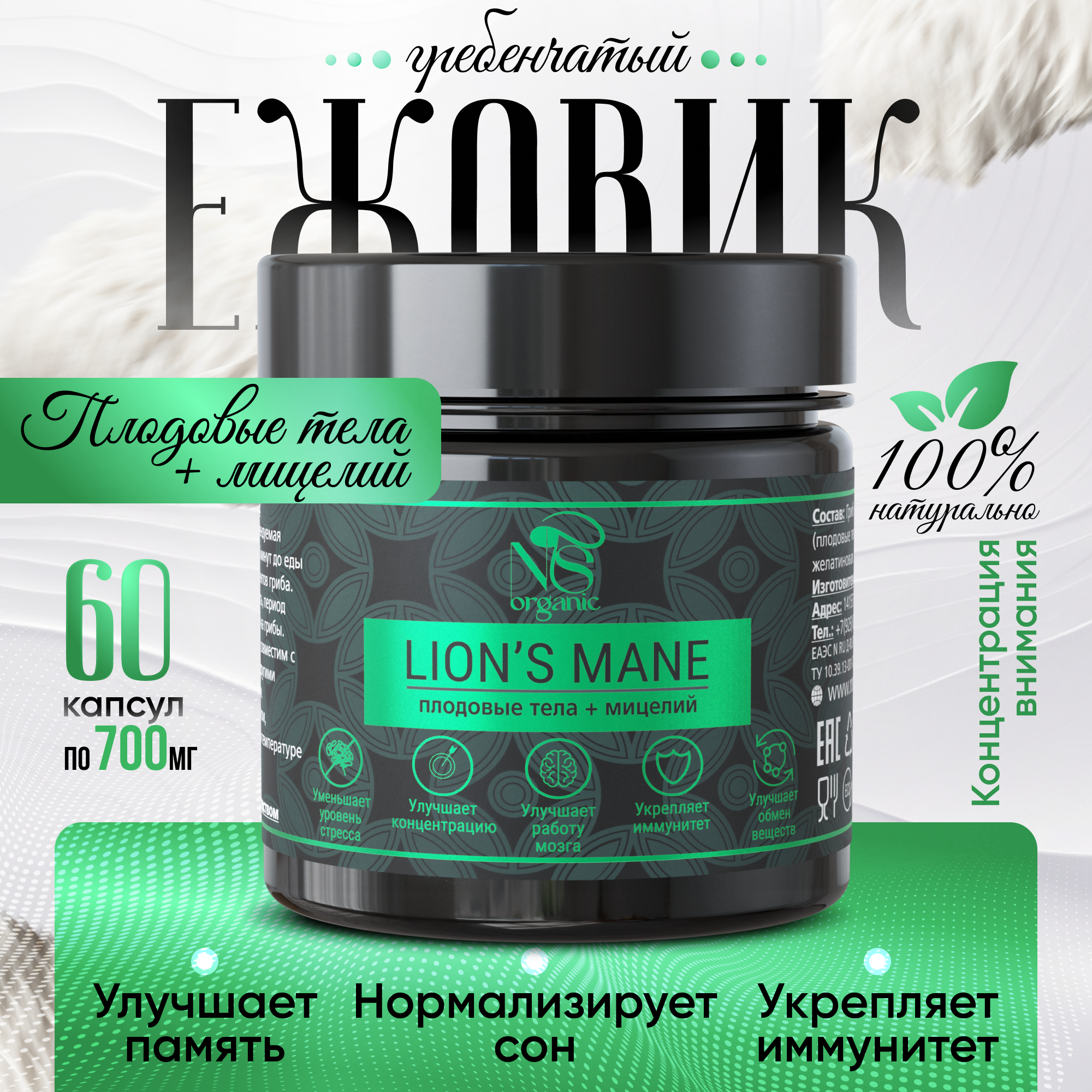 Ежовик гребенчатый, плодовые тела lions mane + мицелий, капсулы 60 шт.