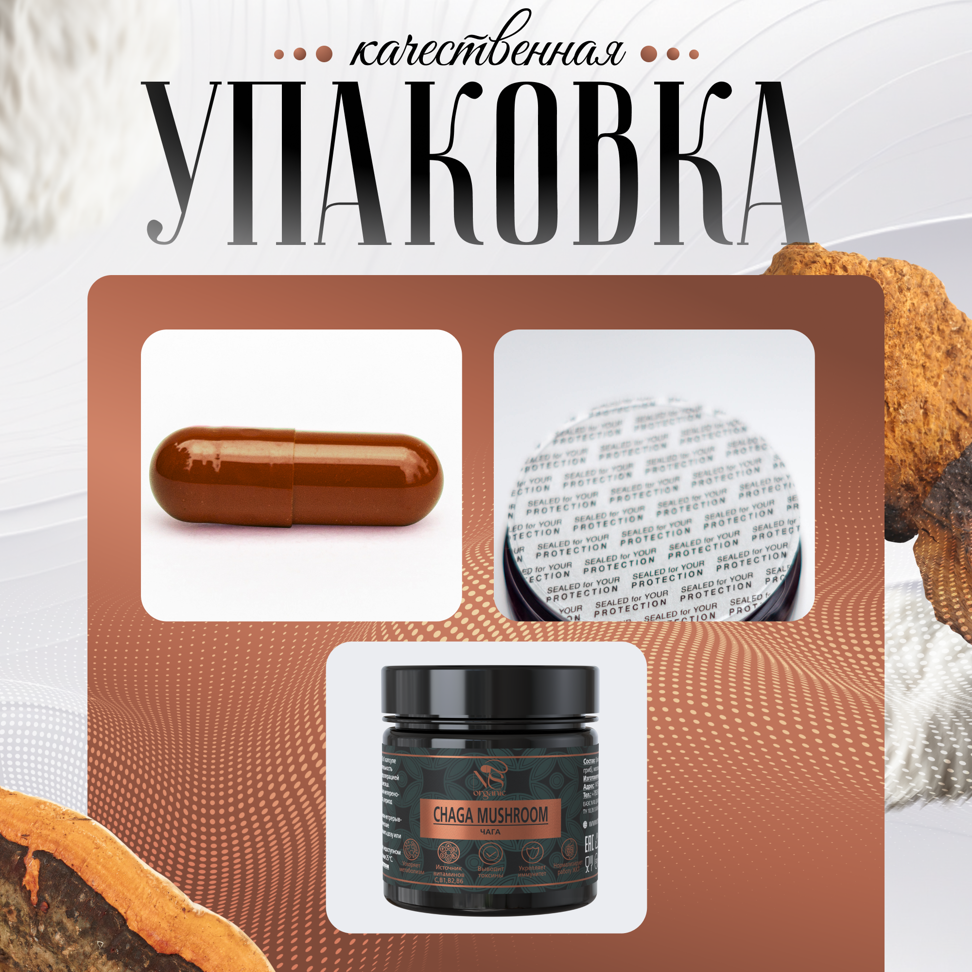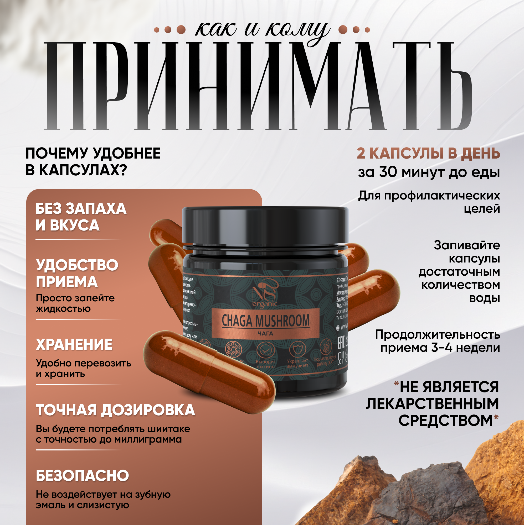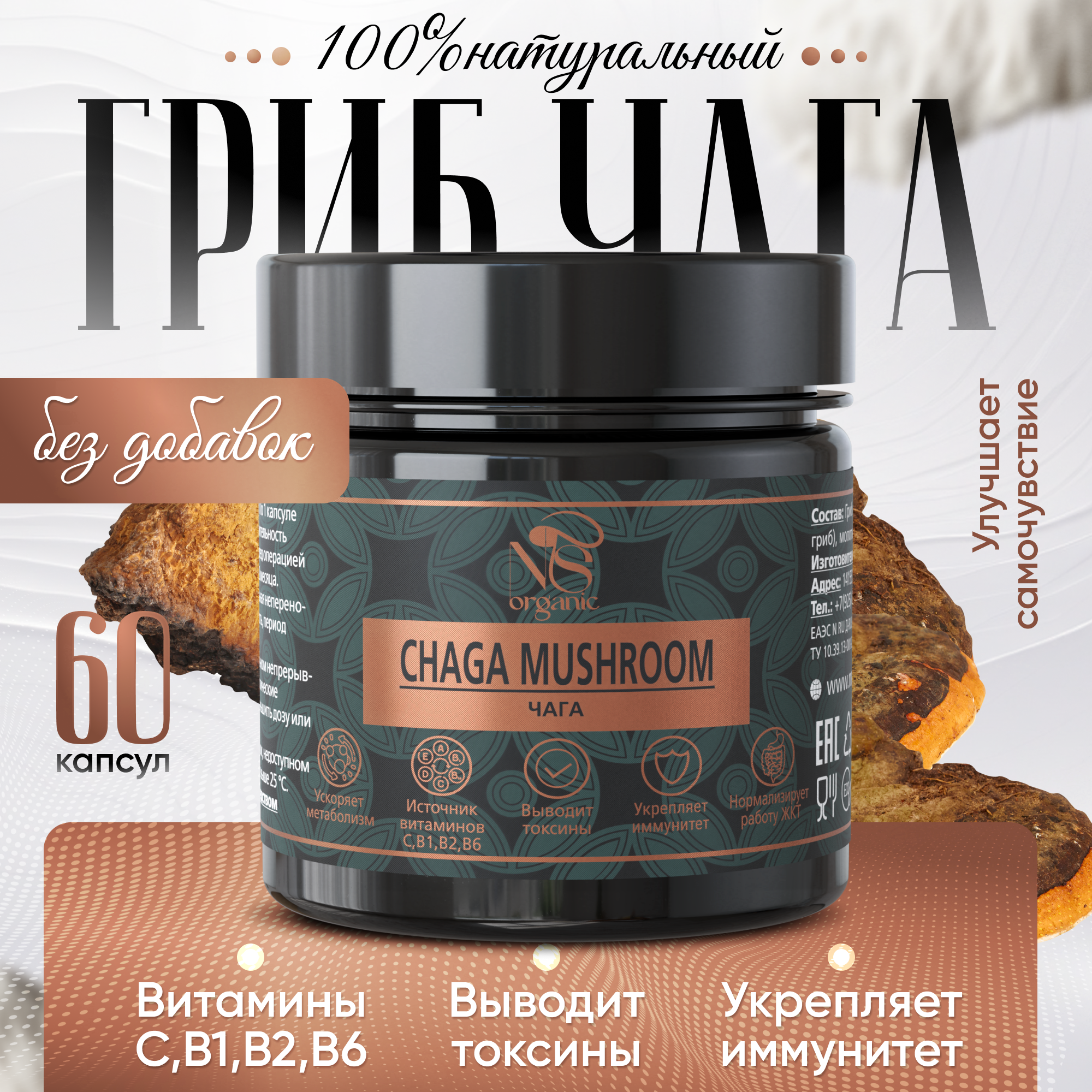 Чага (Inonotus obliquus) относится к роду и виду трутовик скошенный, его еще называют черный березовый или древесный гриб. Особенно распространен в сибирских лесах. Уникален тем, что произрастает на живых березовых деревьях, вплетаясь в их биосинтез дубильных и иных веществ. Именно поэтому мы собираем его исключительно с живых деревьев в определенное время года, когда он набирает максимум питательных веществ. Бережная сушка позволяет сохранить всю ценность гриба. Натуральный и полезный экопродукт, вобравший в себя целебные свойства русской березы. Высушенная молотая органик чага для удобства приема расфасована в капсулы. Вам не требуется ничего взвешивать, заваривать, настаивать. Принимайте по 1 капсуле 2 раза в день до еды, длительность приема составляет 3-4 недели. Это превосходное средство с противовирусным и бактерицидным эффектом. Подавляет рост целого ряда патогенных вирусов. Широко используется для лечения болезней желудочно – кишечного тракта: гастрит, язва желудка и двенадцатиперстной кишки, воспалительные заболевания печени, поджелудочной железы, дискинезия. Помимо улучшения работы ЖКТ, сублимированный экстракт этого ценного гриба способствует нормализации обмена веществ. Облегчает состояние больных, страдающих сахарным диабетом 2 типа, снижает количество сахара в крови, оказывает мочегонное и желчегонное действие. Используется в комплексной терапии для похудения, снижения веса. Широко известны противоопухолевые лечебные свойства гриба. На начальной стадии онкологии сдерживает рост патологически измененных клеток. Можно принимать и для профилактики появления новообразований. Кроме того, сухой концентрат оказывает антиоксидантное, обезболивающее действие. Повышает защитные реакции организма. Обладает общеукрепляющим и тонизирующим эффектом, т.к. содержит огромное количество органических кислот и природных стимуляторов. Прекрасное средство для поддержания энергии и продления молодости. Содержит бетулин, который благотворно влияет на кожу. БАД помогает при заболеваниях кожи: псориаз, дерматит, уменьшает воспаления. Благотворно влияет на состояние половой сферы (как женской, так и мужской). Снижает обострение хронических заболеваний. Настоящая природная аптека!