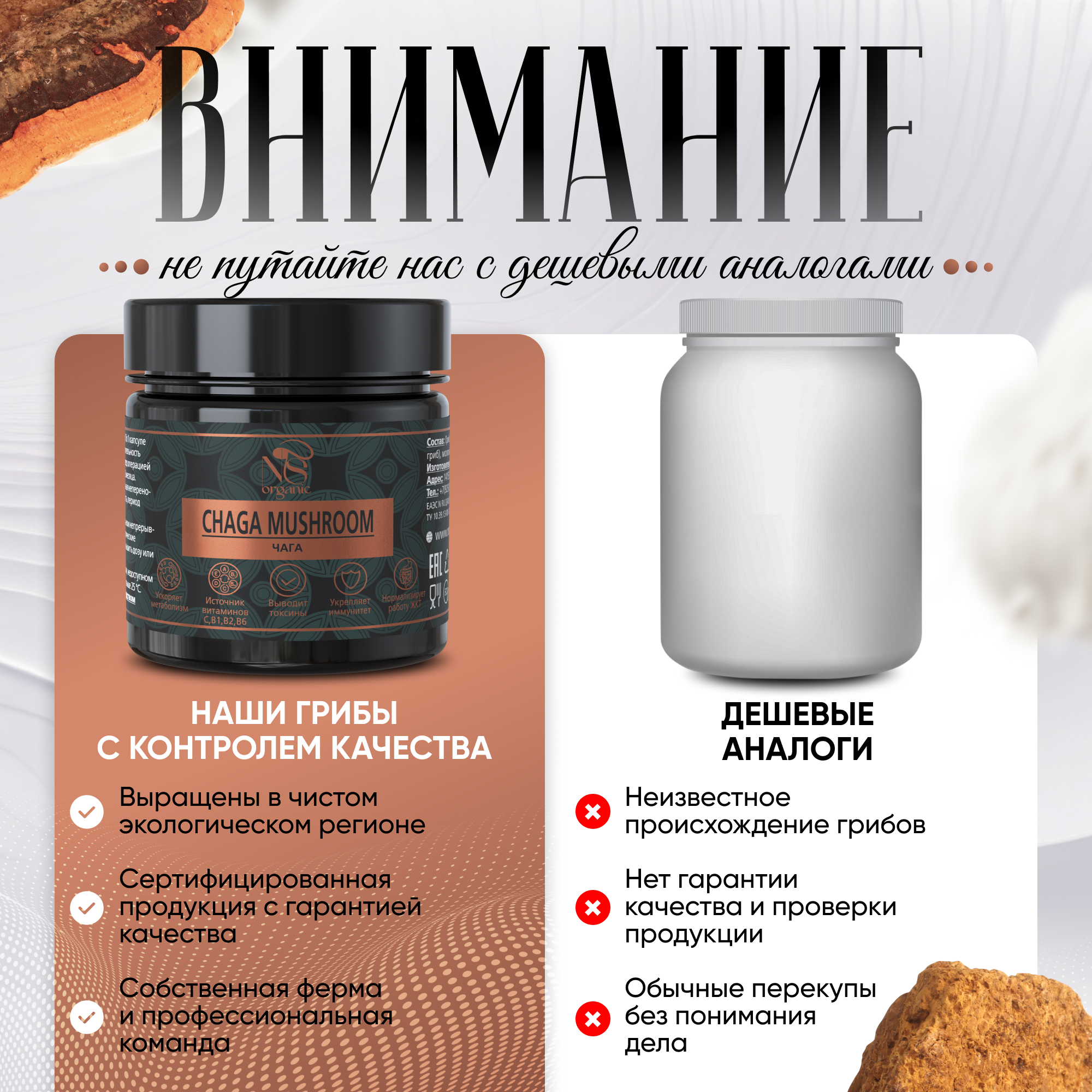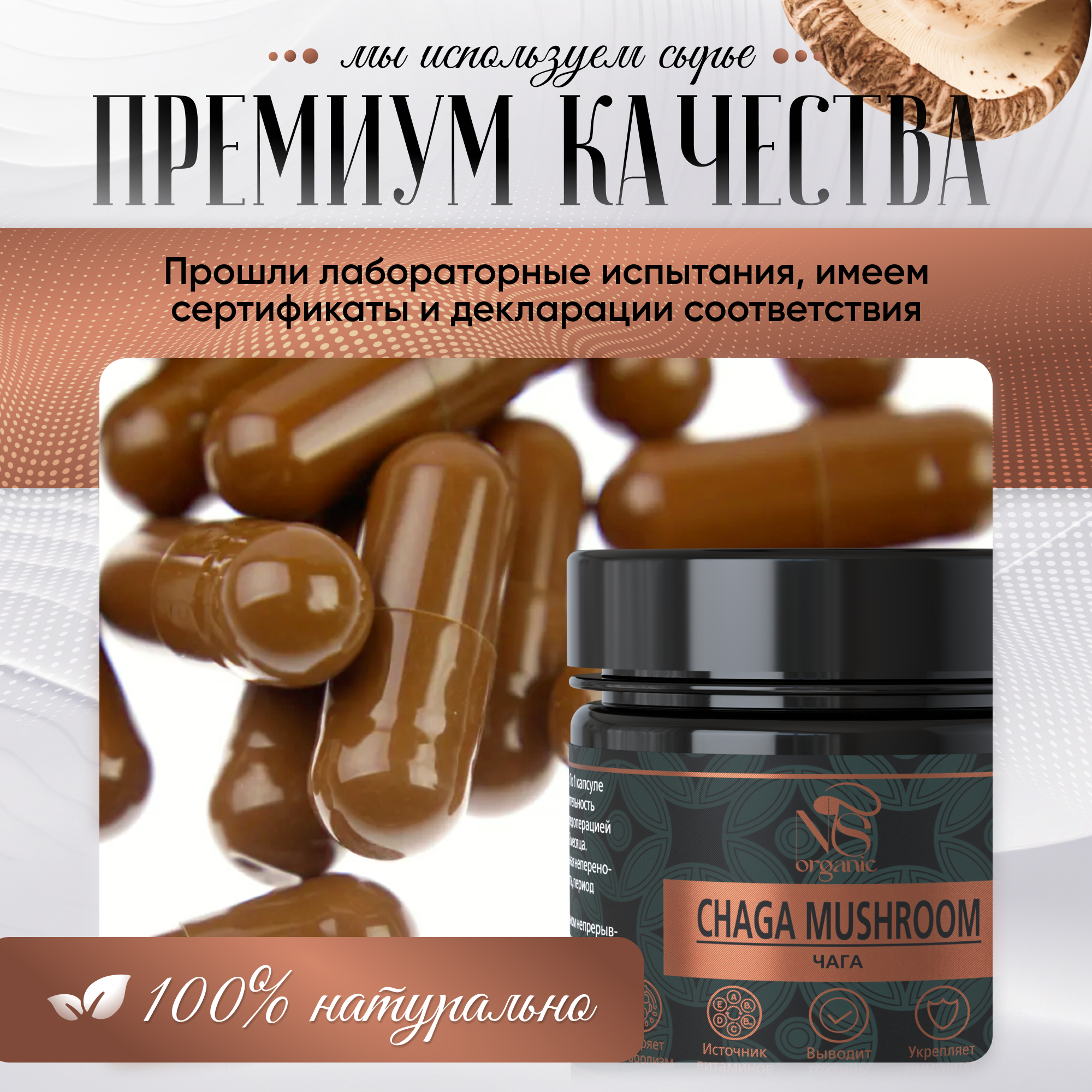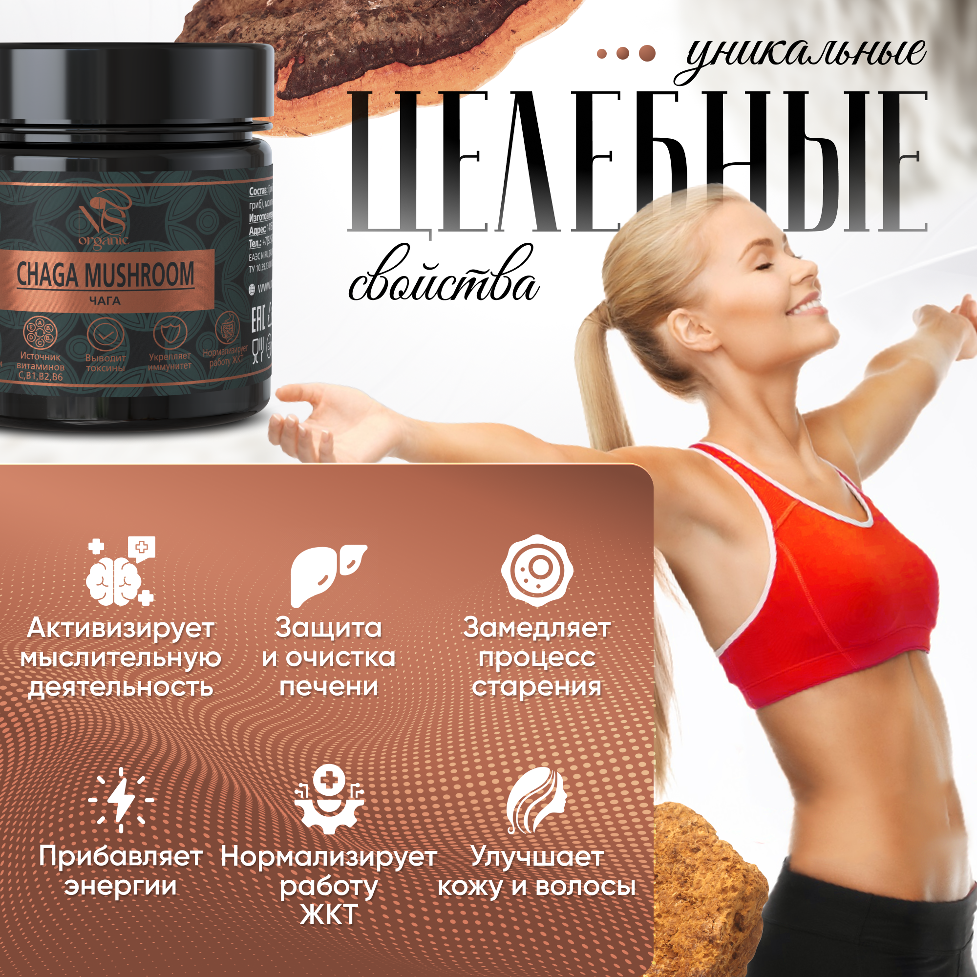 Чага (Inonotus obliquus) относится к роду и виду трутовик скошенный, его еще называют черный березовый или древесный гриб. Особенно распространен в сибирских лесах. Уникален тем, что произрастает на живых березовых деревьях, вплетаясь в их биосинтез дубильных и иных веществ. Именно поэтому мы собираем его исключительно с живых деревьев в определенное время года, когда он набирает максимум питательных веществ. Бережная сушка позволяет сохранить всю ценность гриба. Натуральный и полезный экопродукт, вобравший в себя целебные свойства русской березы. Высушенная молотая органик чага для удобства приема расфасована в капсулы. Вам не требуется ничего взвешивать, заваривать, настаивать. Принимайте по 1 капсуле 2 раза в день до еды, длительность приема составляет 3-4 недели. Это превосходное средство с противовирусным и бактерицидным эффектом. Подавляет рост целого ряда патогенных вирусов. Широко используется для лечения болезней желудочно – кишечного тракта: гастрит, язва желудка и двенадцатиперстной кишки, воспалительные заболевания печени, поджелудочной железы, дискинезия. Помимо улучшения работы ЖКТ, сублимированный экстракт этого ценного гриба способствует нормализации обмена веществ. Облегчает состояние больных, страдающих сахарным диабетом 2 типа, снижает количество сахара в крови, оказывает мочегонное и желчегонное действие. Используется в комплексной терапии для похудения, снижения веса. Широко известны противоопухолевые лечебные свойства гриба. На начальной стадии онкологии сдерживает рост патологически измененных клеток. Можно принимать и для профилактики появления новообразований. Кроме того, сухой концентрат оказывает антиоксидантное, обезболивающее действие. Повышает защитные реакции организма. Обладает общеукрепляющим и тонизирующим эффектом, т.к. содержит огромное количество органических кислот и природных стимуляторов. Прекрасное средство для поддержания энергии и продления молодости. Содержит бетулин, который благотворно влияет на кожу. БАД помогает при заболеваниях кожи: псориаз, дерматит, уменьшает воспаления. Благотворно влияет на состояние половой сферы (как женской, так и мужской). Снижает обострение хронических заболеваний. Настоящая природная аптека!