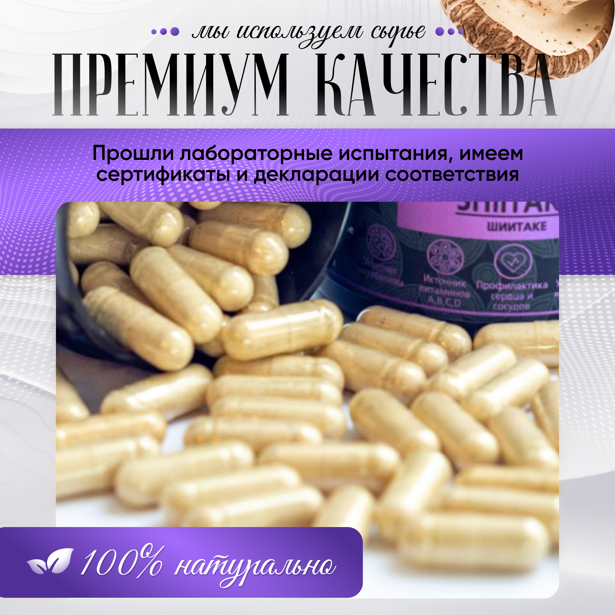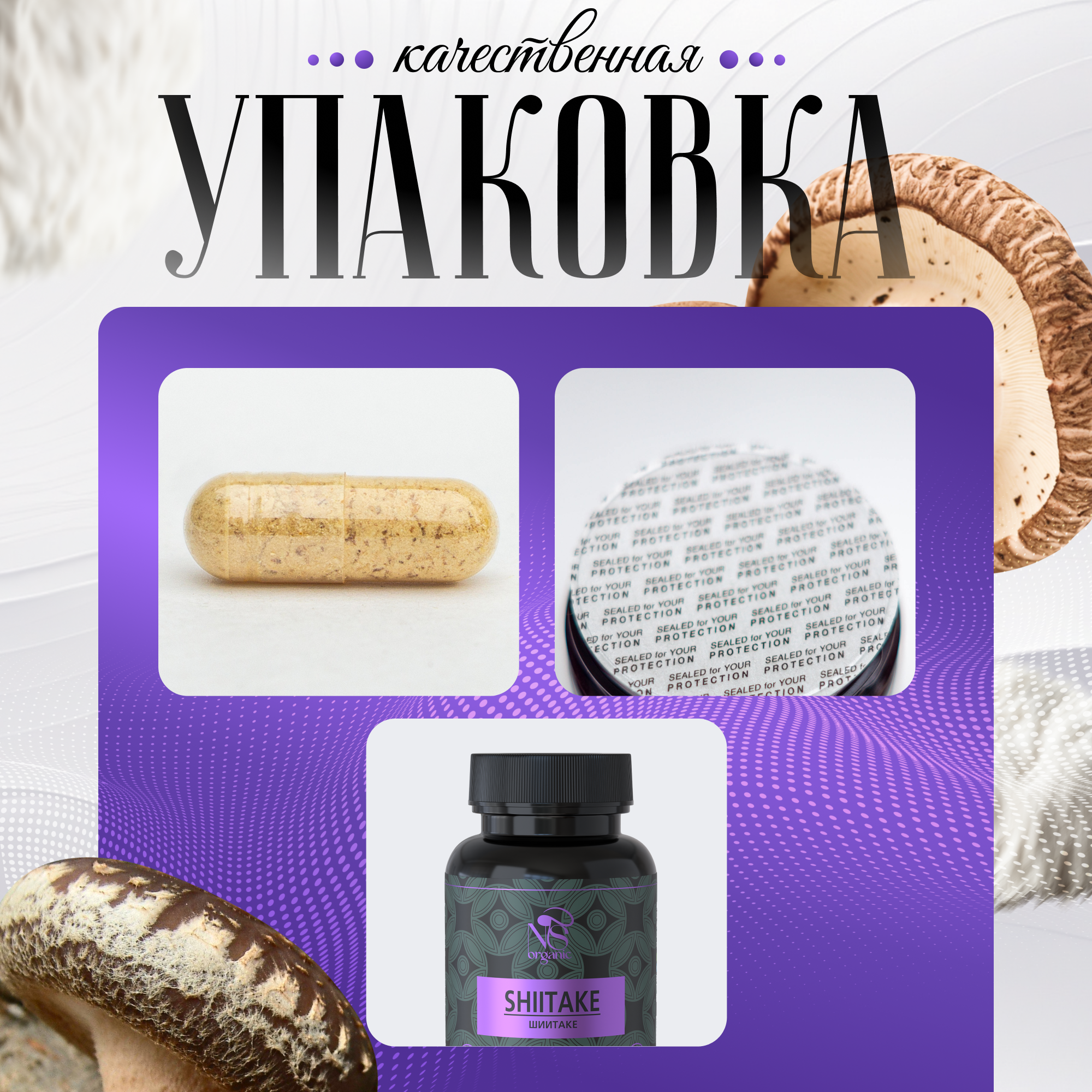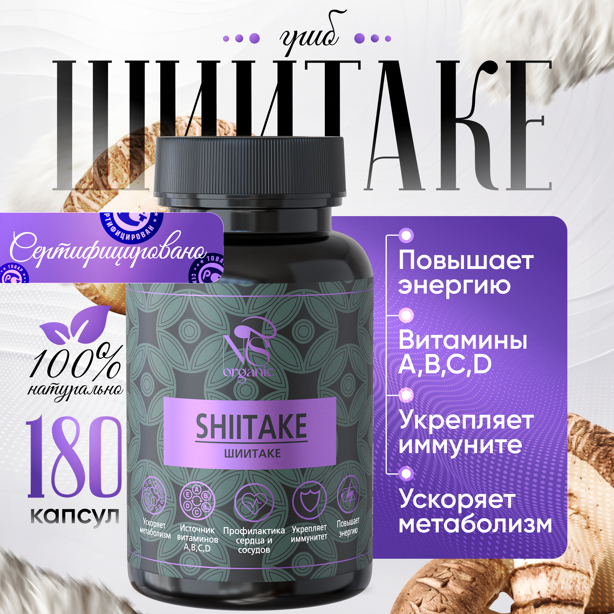 Грибы шиитаке – одни из самых известных азиатских грибов, используемых как для приготовления еды, так и в качестве лечебного продукта. Одно из его названий говорит само за себя – «императорский гриб», т.к. ранее он входил в обязательный рацион правящих династий Японии и Китая, и поставлялся только к императорскому столу. Также в разных странах его называют по-разному: шианг-гу, хоанг-мо, сянгу, пёго. Lentinula edodes (лентинула съедобная), известная также как сиитаке, японский лесной гриб, черный гриб, муэр, ноки и относится к древесным грибам. В природных условиях растет на стволах поваленных деревьев, пнях и похож на вешенки. Только в таком симбиозе он приобретает свои уникальные свойства. Чтобы воссоздать условия, максимально приближенные к естественным, мы выращиваем его исключительно на брусьях, поленьях, бревнах и деревьях (дуб, клен, каштан). Грибные фермы расположены в России, поэтому весь процесс от выращивания до упаковки готового продукта прозрачен и постоянно контролируется на каждом этапе. 100% organic. Есть фасовка по 60, 90 и 120 желатиновых капсул. Сушеный и молотый шитаки содержит целый комплекс витаминов группы В, микроэлементы калий, фосфор, магний, аминокислоты. БАД незаменим для взрослых, как женщин, так и мужчин, для поддержания здоровья и восстановления печени и ЖКТ. Препараты на его основе улучшают перистальтику кишечника, способствуют заживлению язв на слизистой оболочке желудка. Желчегонный эффект способствует выведению продуктов распада и в целом детоксу и очищению организма. Сходное действие оказывает и присутствующий в составе шиитаке хитин: он выводит из организма токсины и вредные химические вещества. Биологически активная пищевая добавка способствует снижению веса и похудению, нормализует углеводный и жировой обмен. Грибы, в т.ч. и сухие, используются для лечения сахарного диабета 2 типа, так как они улучшают метаболизм, снижают уровень сахара в крови. Это природное лекарство - иммуномодулятор, которое помогает укрепить ослабленный иммунитет, повышает сопротивляемость организма различным инфекциям. Антивирусное средство, незаменимый помощник в борьбе не только против вирусов, но и бактерий, а также грибковых заболеваний. Поможет справиться с аллергией. Большую роль играет экстракт шиитаке в борьбе с новообразованиями. В фунготерапии и китайской медицине он используется как противоопухолевый препарат для лечения и поддержания иммунитета больных с онкологией, некоторыми видами рака. Уменьшает риск заболевания сердечно-сосудистых заболеваний, снижает уровень холестерина в крови и образование бляшек на стенках сосудов. Повышает половую функцию у мужчин. Это настоящий омолаживающий эликсир здоровья и долголетия с широким спектром благотворного действия на многие системы организма. Все грибы свежие и заготавливаются по необходимости в таком количестве, которое мы сможем реализовать.