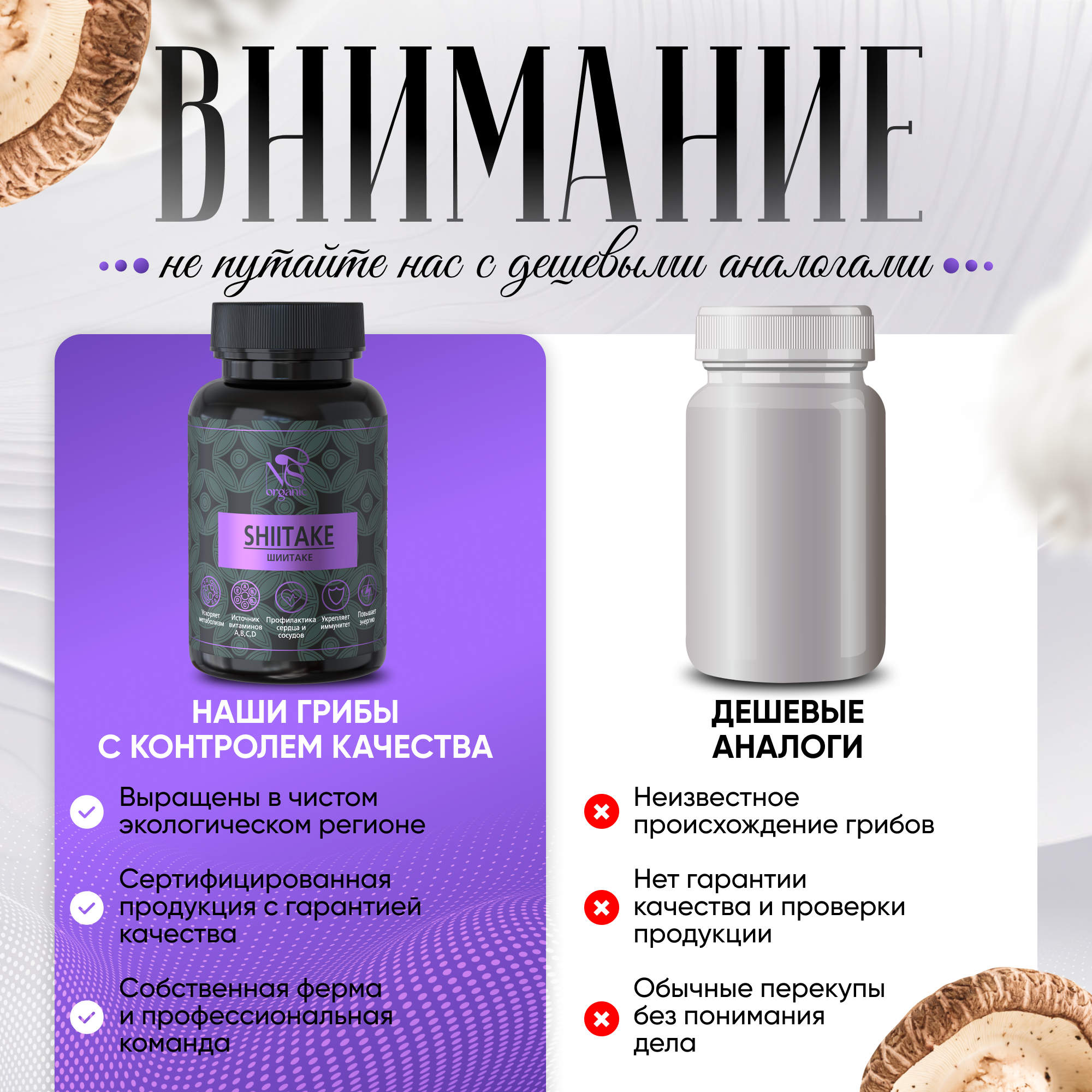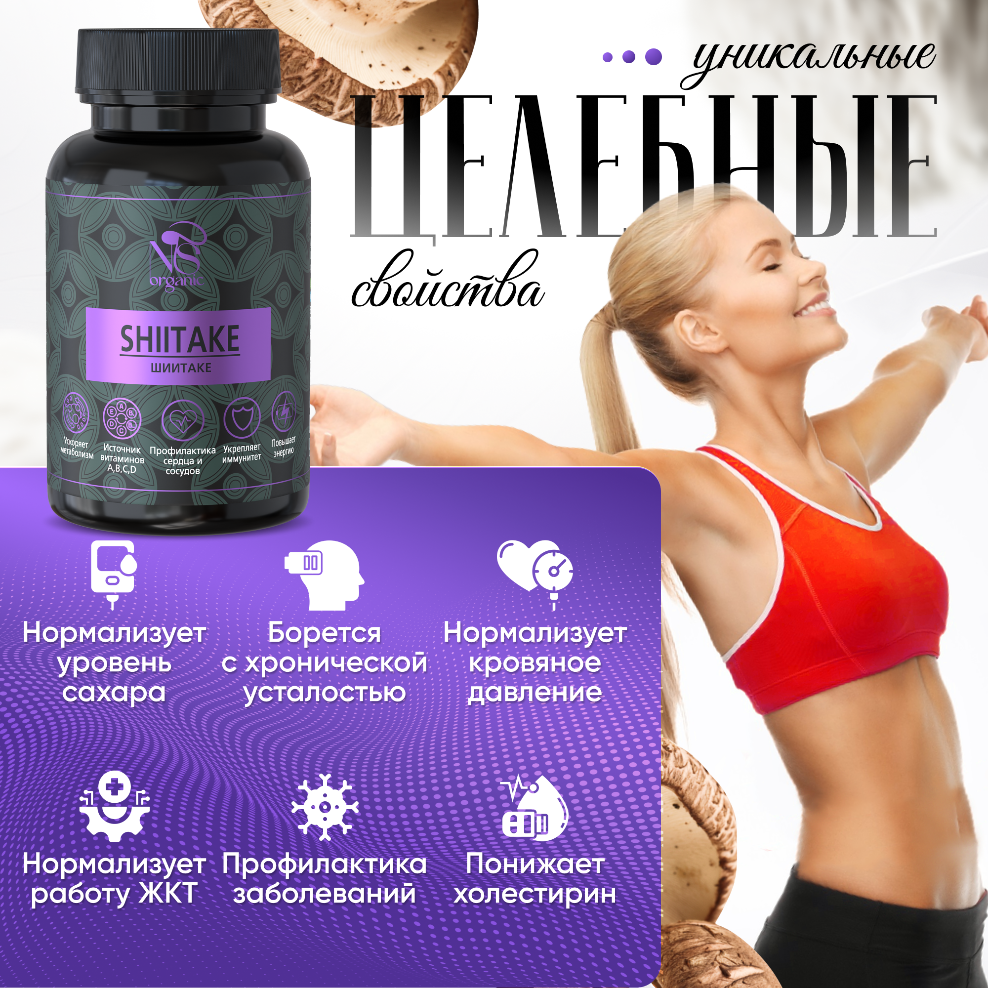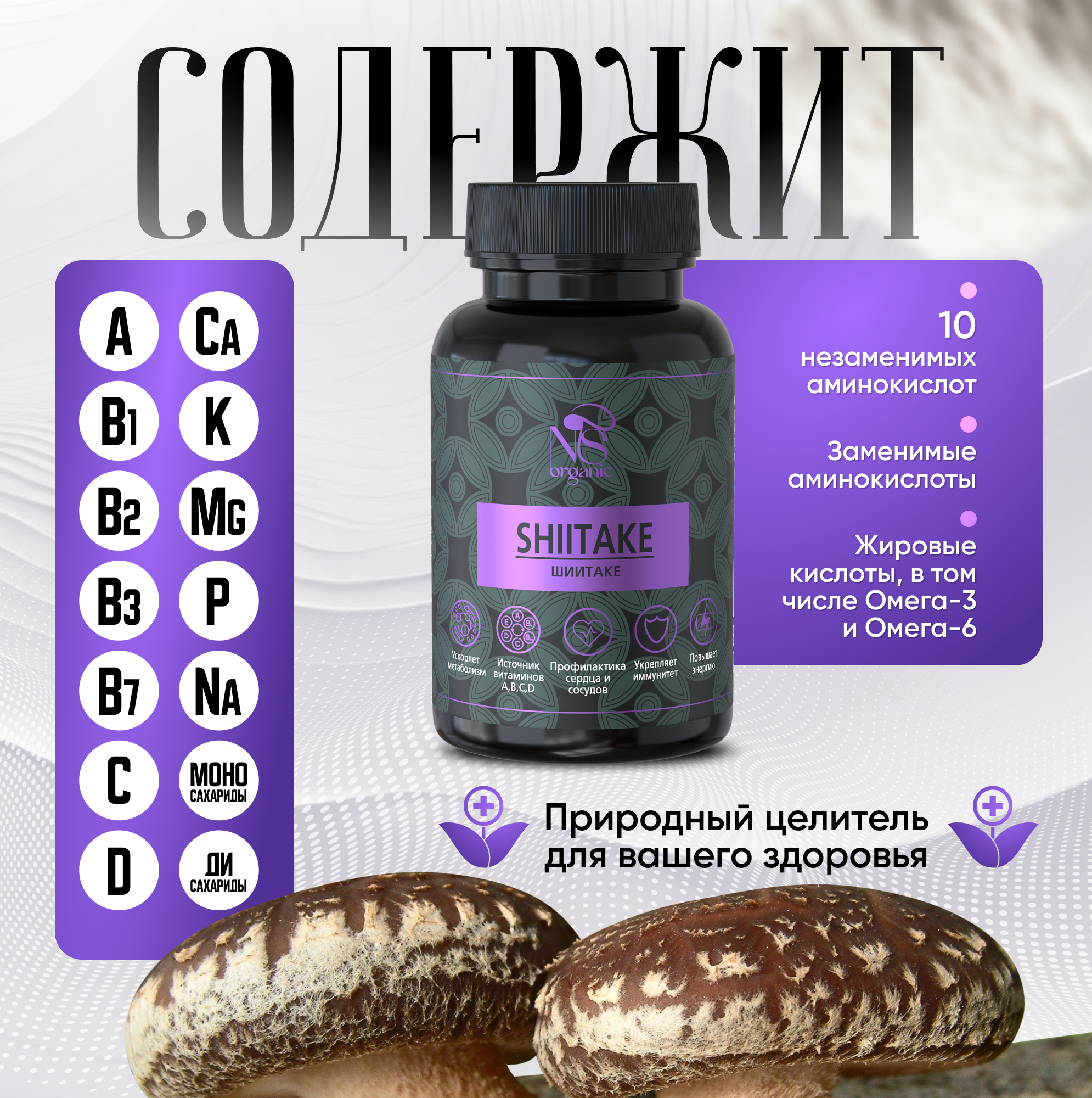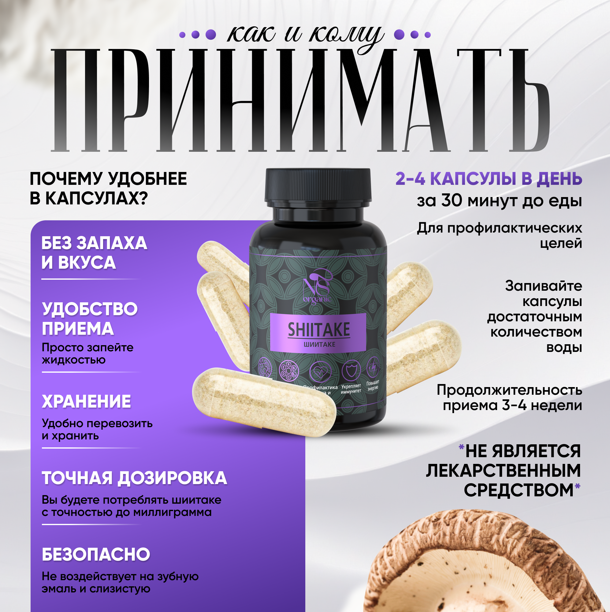 Грибы шиитаке – одни из самых известных азиатских грибов, используемых как для приготовления еды, так и в качестве лечебного продукта. Одно из его названий говорит само за себя – «императорский гриб», т.к. ранее он входил в обязательный рацион правящих династий Японии и Китая, и поставлялся только к императорскому столу. Также в разных странах его называют по-разному: шианг-гу, хоанг-мо, сянгу, пёго. Lentinula edodes (лентинула съедобная), известная также как сиитаке, японский лесной гриб, черный гриб, муэр, ноки и относится к древесным грибам. В природных условиях растет на стволах поваленных деревьев, пнях и похож на вешенки. Только в таком симбиозе он приобретает свои уникальные свойства. Чтобы воссоздать условия, максимально приближенные к естественным, мы выращиваем его исключительно на брусьях, поленьях, бревнах и деревьях (дуб, клен, каштан). Грибные фермы расположены в России, поэтому весь процесс от выращивания до упаковки готового продукта прозрачен и постоянно контролируется на каждом этапе. 100% organic. Есть фасовка по 60, 90 и 120 желатиновых капсул. Сушеный и молотый шитаки содержит целый комплекс витаминов группы В, микроэлементы калий, фосфор, магний, аминокислоты. БАД незаменим для взрослых, как женщин, так и мужчин, для поддержания здоровья и восстановления печени и ЖКТ. Препараты на его основе улучшают перистальтику кишечника, способствуют заживлению язв на слизистой оболочке желудка. Желчегонный эффект способствует выведению продуктов распада и в целом детоксу и очищению организма. Сходное действие оказывает и присутствующий в составе шиитаке хитин: он выводит из организма токсины и вредные химические вещества. Биологически активная пищевая добавка способствует снижению веса и похудению, нормализует углеводный и жировой обмен. Грибы, в т.ч. и сухие, используются для лечения сахарного диабета 2 типа, так как они улучшают метаболизм, снижают уровень сахара в крови. Это природное лекарство - иммуномодулятор, которое помогает укрепить ослабленный иммунитет, повышает сопротивляемость организма различным инфекциям. Антивирусное средство, незаменимый помощник в борьбе не только против вирусов, но и бактерий, а также грибковых заболеваний. Поможет справиться с аллергией. Большую роль играет экстракт шиитаке в борьбе с новообразованиями. В фунготерапии и китайской медицине он используется как противоопухолевый препарат для лечения и поддержания иммунитета больных с онкологией, некоторыми видами рака. Уменьшает риск заболевания сердечно-сосудистых заболеваний, снижает уровень холестерина в крови и образование бляшек на стенках сосудов. Повышает половую функцию у мужчин. Это настоящий омолаживающий эликсир здоровья и долголетия с широким спектром благотворного действия на многие системы организма. Все грибы свежие и заготавливаются по необходимости в таком количестве, которое мы сможем реализовать.