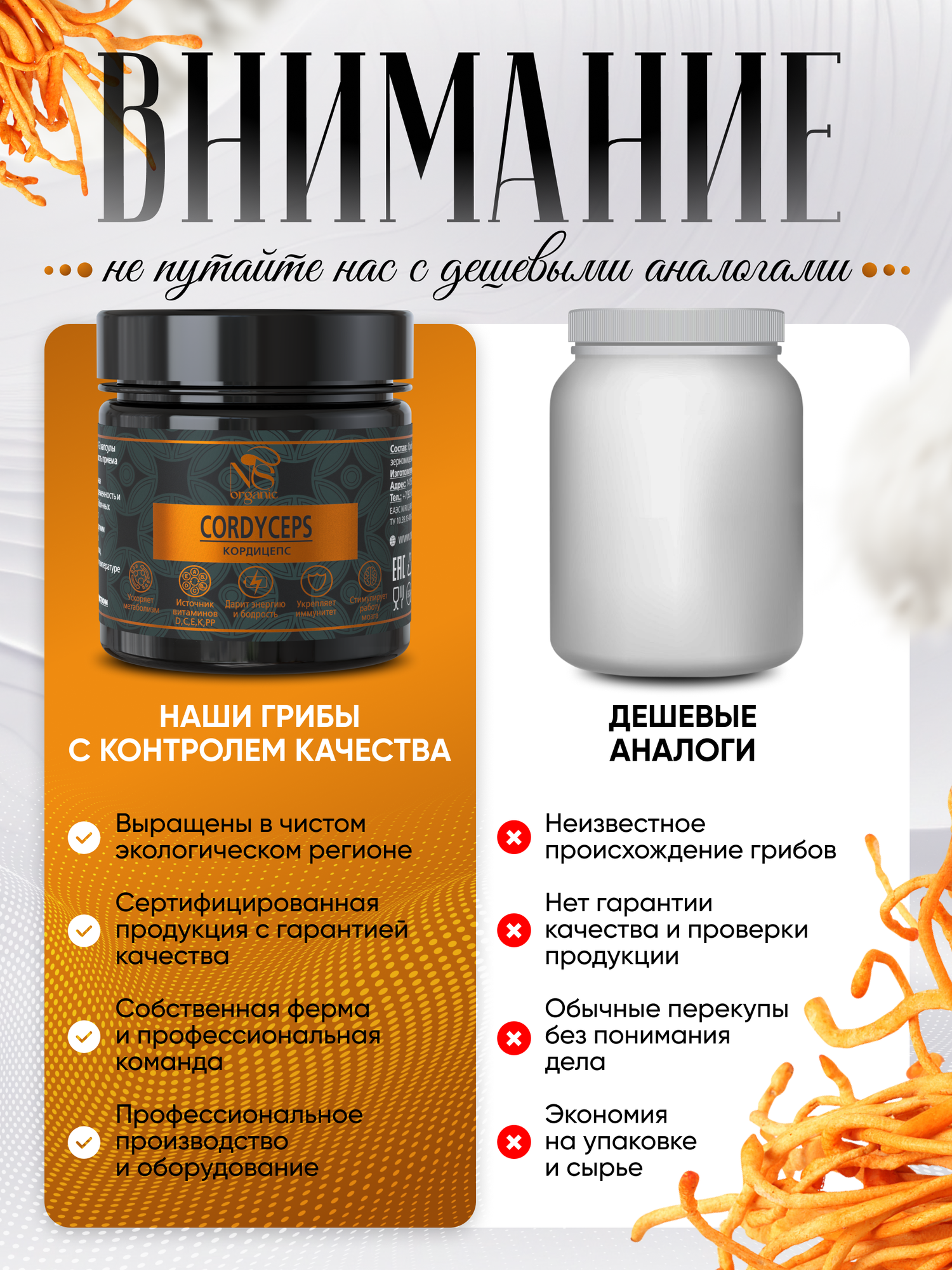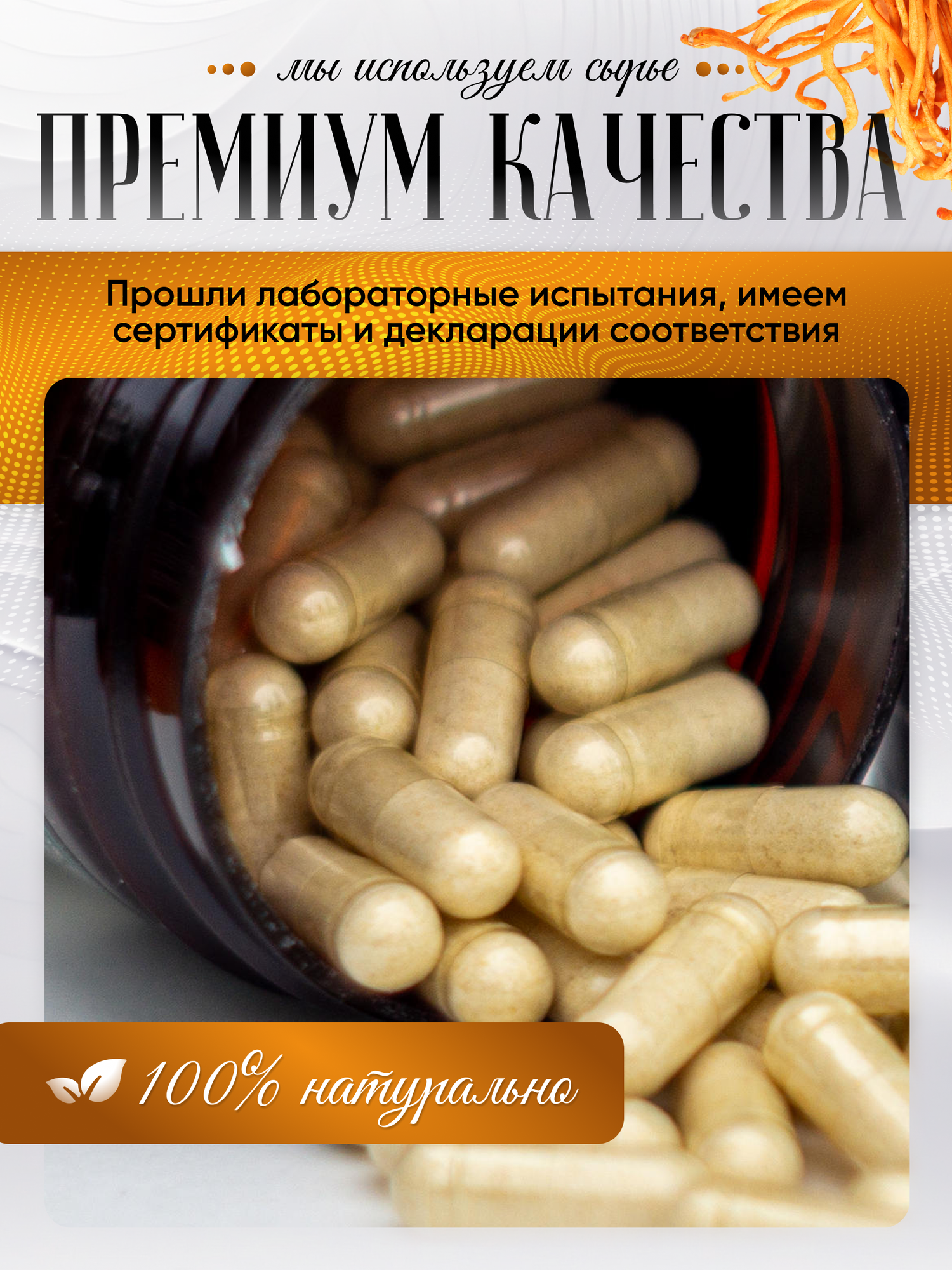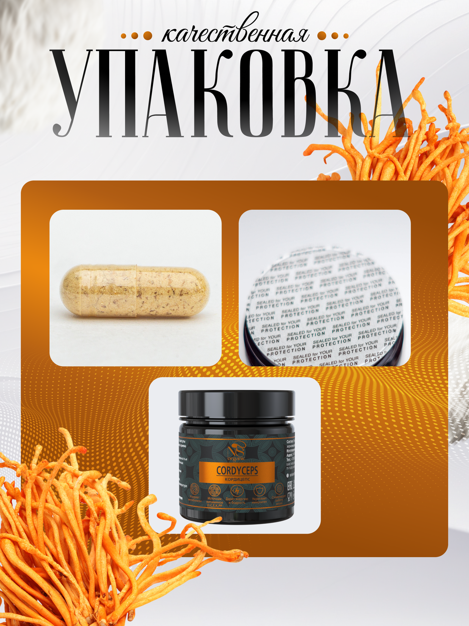 Кордицепс – уникальный и один из самых полезных грибов в мире. Широко применяется в китайской и тибетской медицине как средство для улучшения метаболизма, повышения иммунитета, лечения воспалительных заболеваний. Огромное количество содержащихся в нем витаминов, микро- и макроэлементов имеют высокую антимикробную, противоопухолевую и антиоксидантную активность. Этот препарат незаменим как для мужского, так и женского здоровья. Экстракт кордицепса увеличивает жизненную силу, выносливость, энергию. Антивозрастное действие на организм заключается в защите клеток от разрушения их свободными радикалами. Замедляет старение, способствует нормализации давления, благотворно влияет на мозг, улучшая память и внимание. Играет большую роль в восстановлении нервной системы, создавая идеальный баланс режима сна и бодрствования. Пищевую добавку можно использовать для укрепления здоровья сердца и сосудов, так как она снижает уровень холестерина в крови. Помогает регулировать уровень сахара, что особенно важно при диабете. Улучшает функцию почек, борется с воспалениями. Имеет прекрасный антистресс эффект, помогает после физических и эмоциональных нагрузок. Традиционно используется для повышения либидо, стимуляции выработки тестостерона и восстановления репродуктивной функции как у мужчин, так и у женщин. Гриб подходит для очищения и детокса от вредных веществ, повышает сопротивление организма неблагоприятным факторам, продлевает молодость. Не является БАД и лекарственным средством.