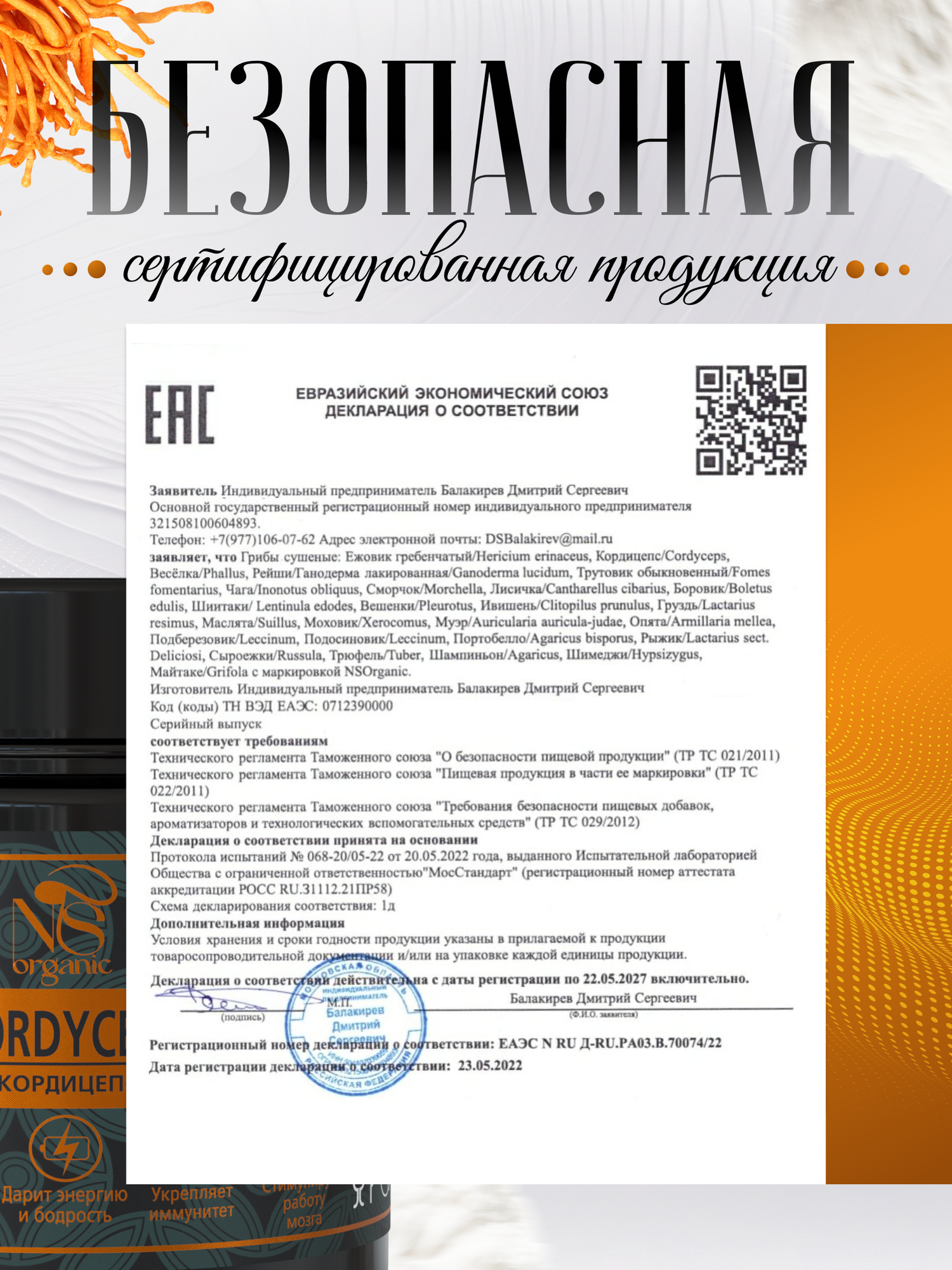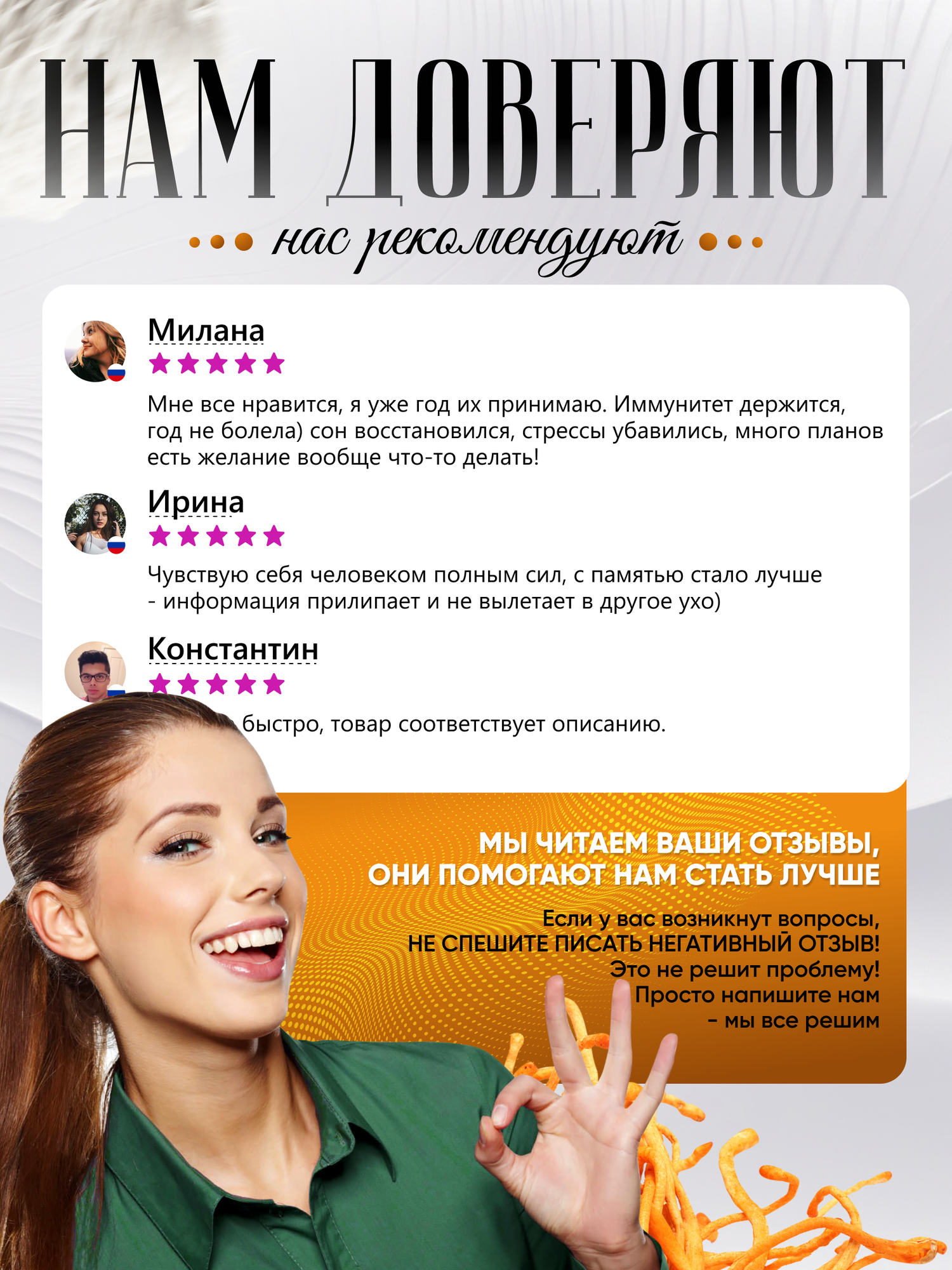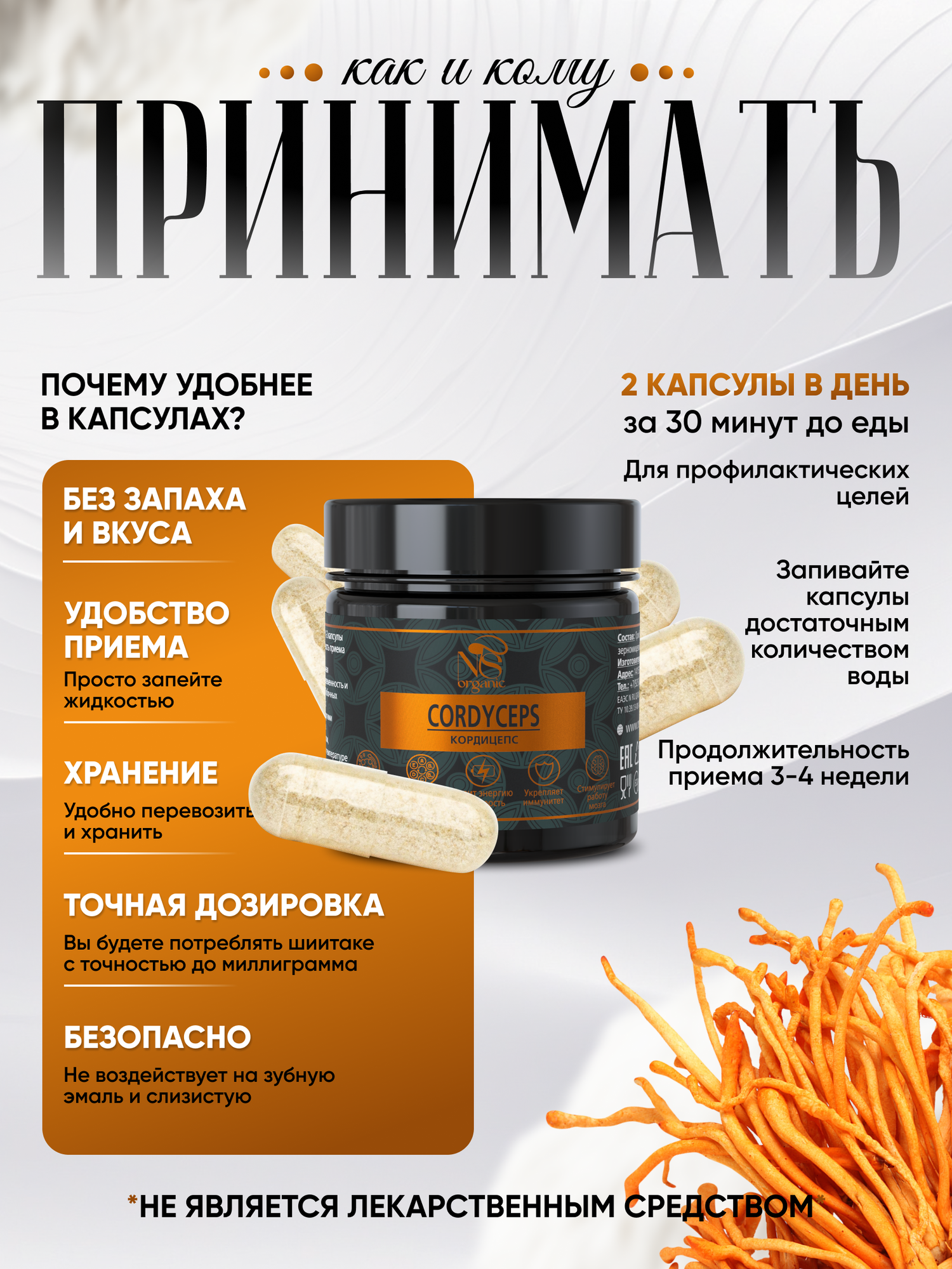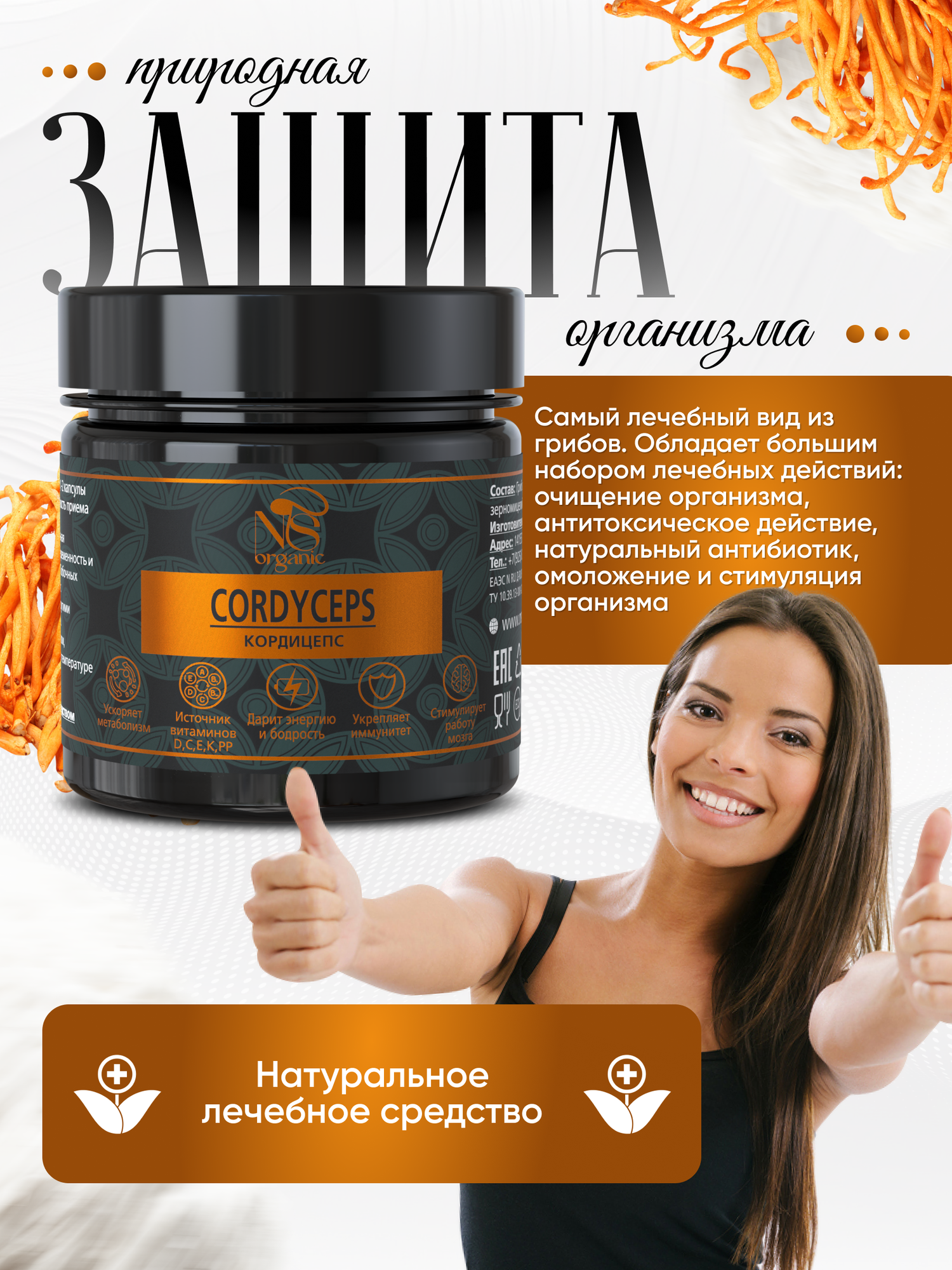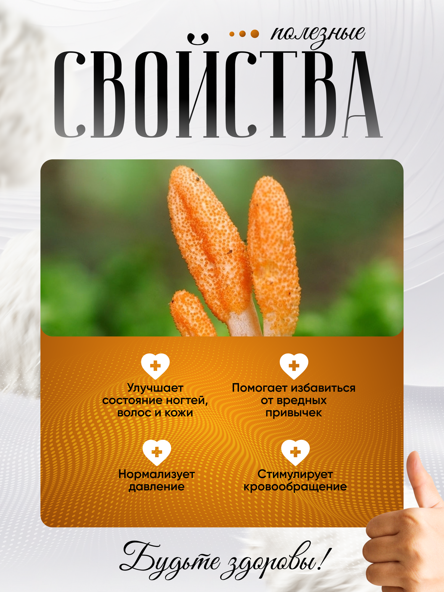 Кордицепс – уникальный и один из самых полезных грибов в мире. Широко применяется в китайской и тибетской медицине как средство для улучшения метаболизма, повышения иммунитета, лечения воспалительных заболеваний. Огромное количество содержащихся в нем витаминов, микро- и макроэлементов имеют высокую антимикробную, противоопухолевую и антиоксидантную активность. Этот препарат незаменим как для мужского, так и женского здоровья. Экстракт кордицепса увеличивает жизненную силу, выносливость, энергию. Антивозрастное действие на организм заключается в защите клеток от разрушения их свободными радикалами. Замедляет старение, способствует нормализации давления, благотворно влияет на мозг, улучшая память и внимание. Играет большую роль в восстановлении нервной системы, создавая идеальный баланс режима сна и бодрствования. Пищевую добавку можно использовать для укрепления здоровья сердца и сосудов, так как она снижает уровень холестерина в крови. Помогает регулировать уровень сахара, что особенно важно при диабете. Улучшает функцию почек, борется с воспалениями. Имеет прекрасный антистресс эффект, помогает после физических и эмоциональных нагрузок. Традиционно используется для повышения либидо, стимуляции выработки тестостерона и восстановления репродуктивной функции как у мужчин, так и у женщин. Гриб подходит для очищения и детокса от вредных веществ, повышает сопротивление организма неблагоприятным факторам, продлевает молодость. Не является БАД и лекарственным средством.