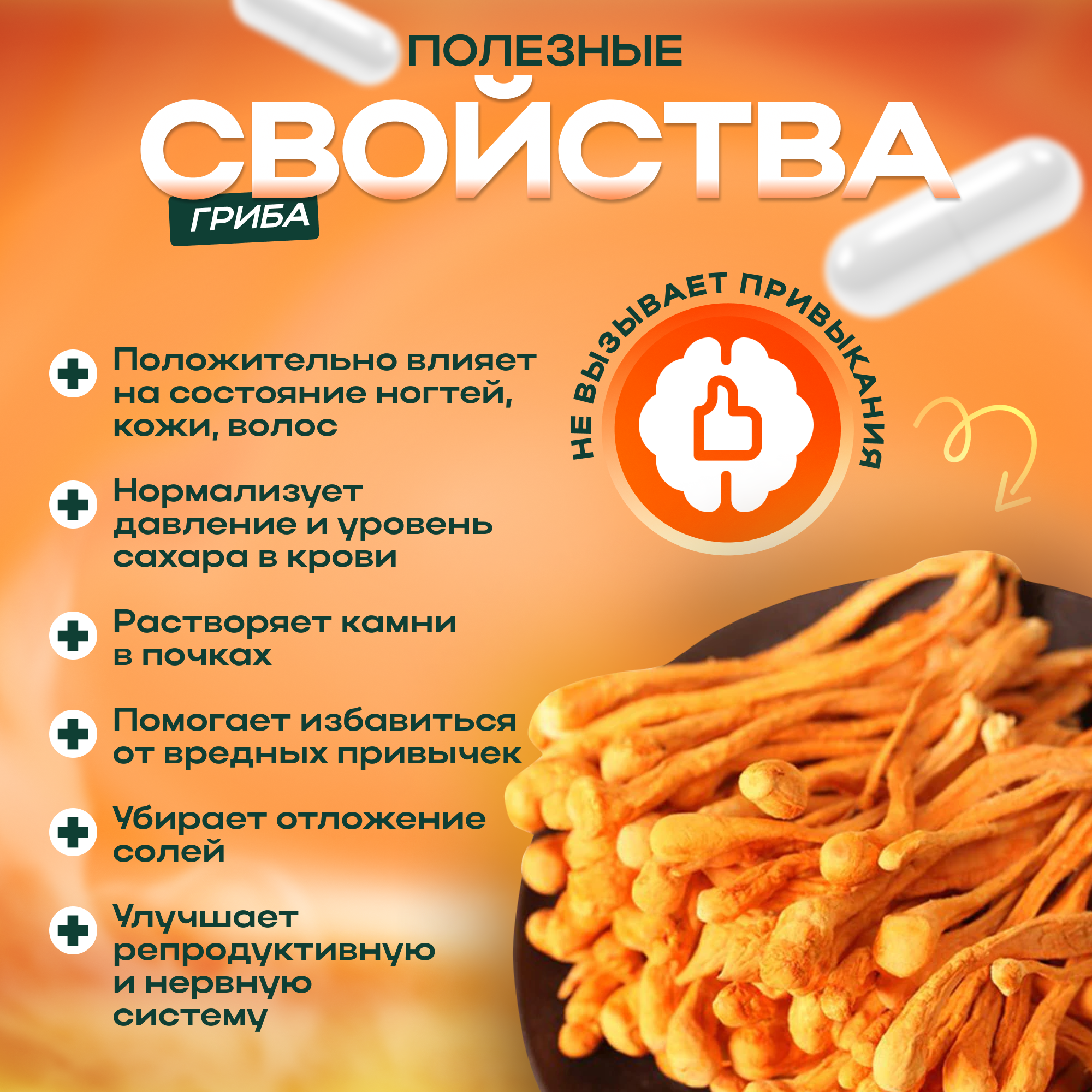 Кордицепс – уникальный и один из самых полезных грибов в мире. Широко применяется в китайской и тибетской медицине как средство для улучшения метаболизма, повышения иммунитета, лечения воспалительных заболеваний. Огромное количество содержащихся в нем витаминов, микро- и макроэлементов имеют высокую антимикробную, противоопухолевую и антиоксидантную активность. Этот препарат незаменим как для мужского, так и женского здоровья. Экстракт кордицепса увеличивает жизненную силу, выносливость, энергию. Антивозрастное действие на организм заключается в защите клеток от разрушения их свободными радикалами. Замедляет старение, способствует нормализации давления, благотворно влияет на мозг, улучшая память и внимание. Играет большую роль в восстановлении нервной системы, создавая идеальный баланс режима сна и бодрствования. Пищевую добавку можно использовать для укрепления здоровья сердца и сосудов, так как она снижает уровень холестерина в крови. Помогает регулировать уровень сахара, что особенно важно при диабете. Улучшает функцию почек, борется с воспалениями. Имеет прекрасный антистресс эффект, помогает после физических и эмоциональных нагрузок. Традиционно используется для повышения либидо, стимуляции выработки тестостерона и восстановления репродуктивной функции как у мужчин, так и у женщин. Гриб подходит для очищения и детокса от вредных веществ, повышает сопротивление организма неблагоприятным факторам, продлевает молодость. Не является БАД и лекарственным средством.